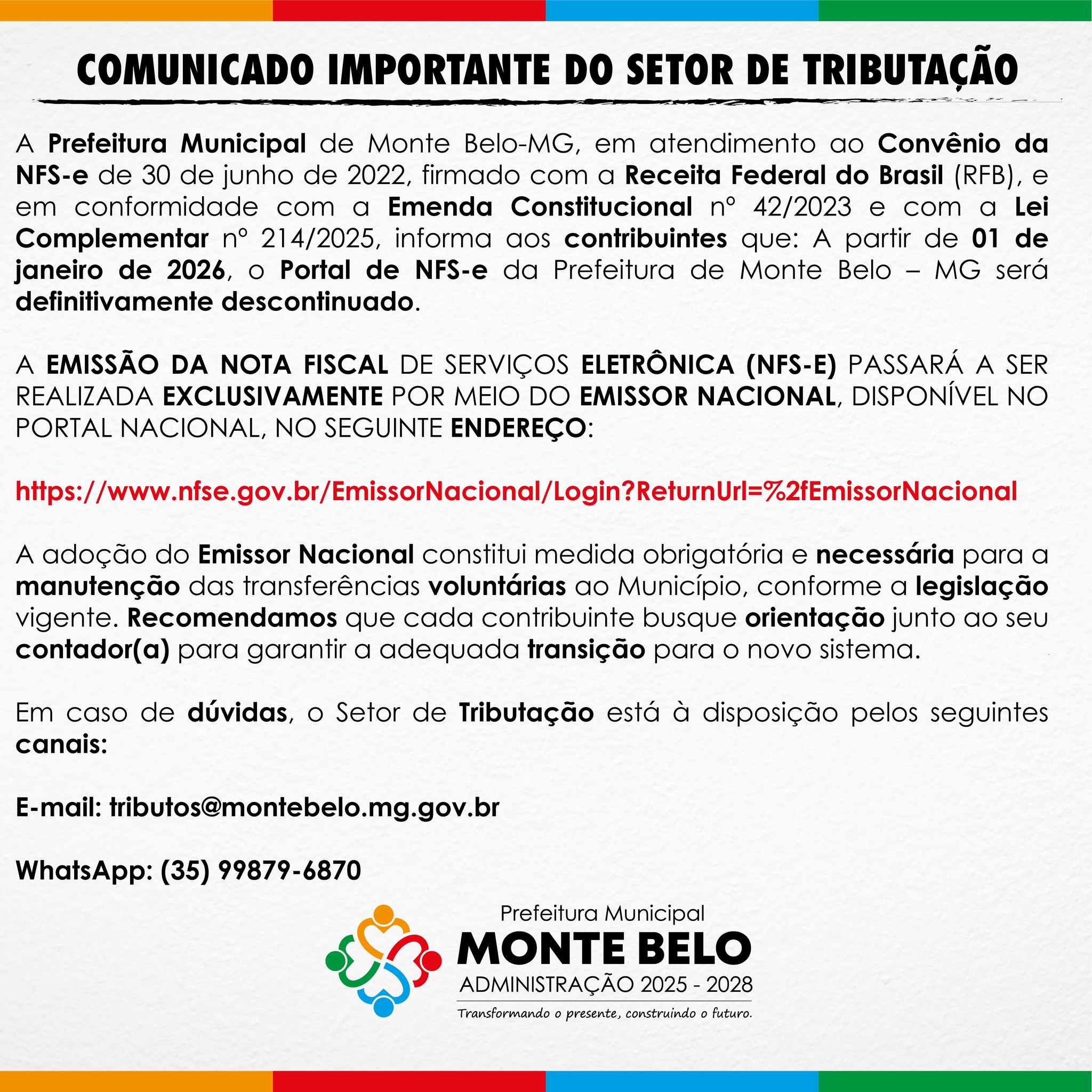 COMUNICADO IMPORTANTE DO SETOR DE TRIBUTAÇÃO