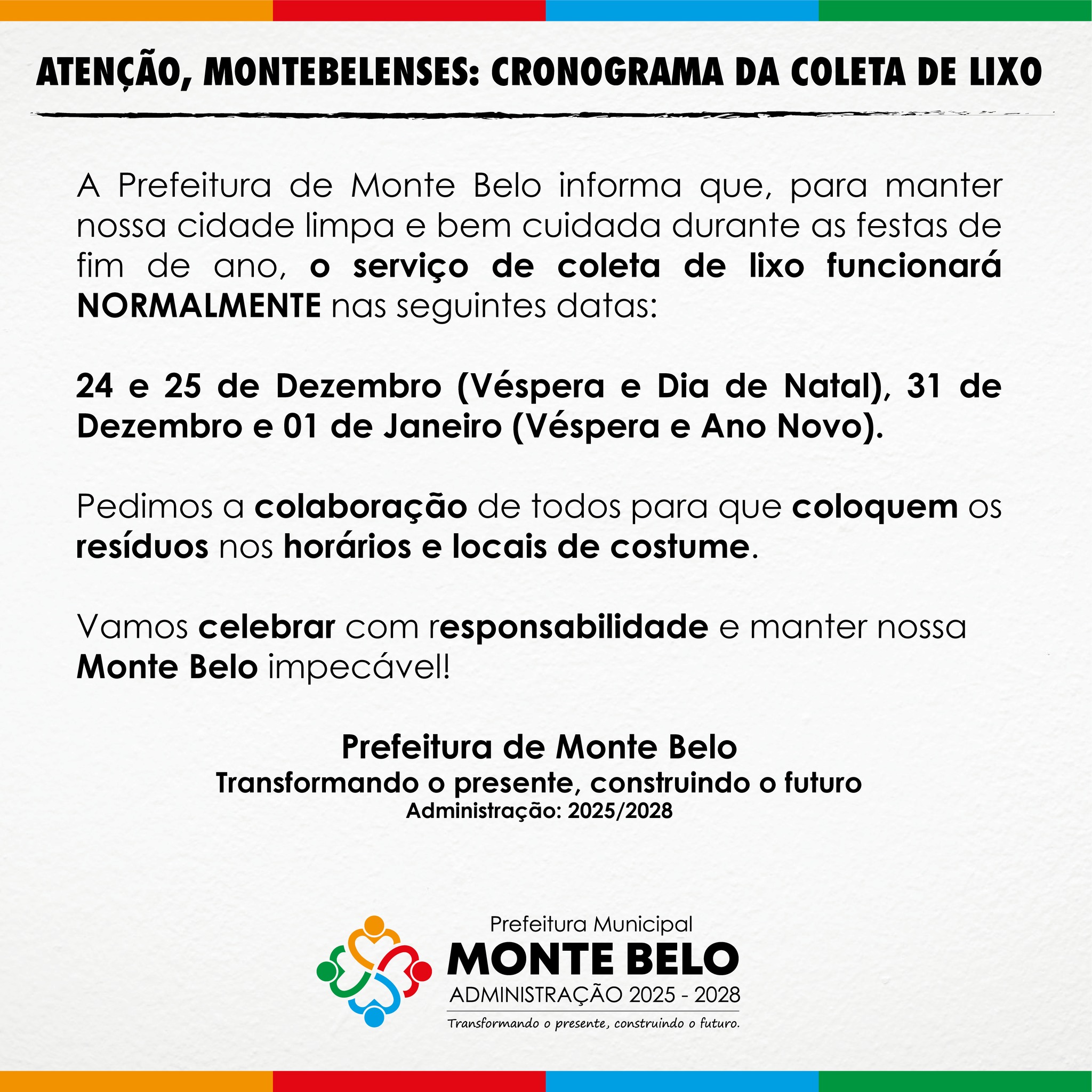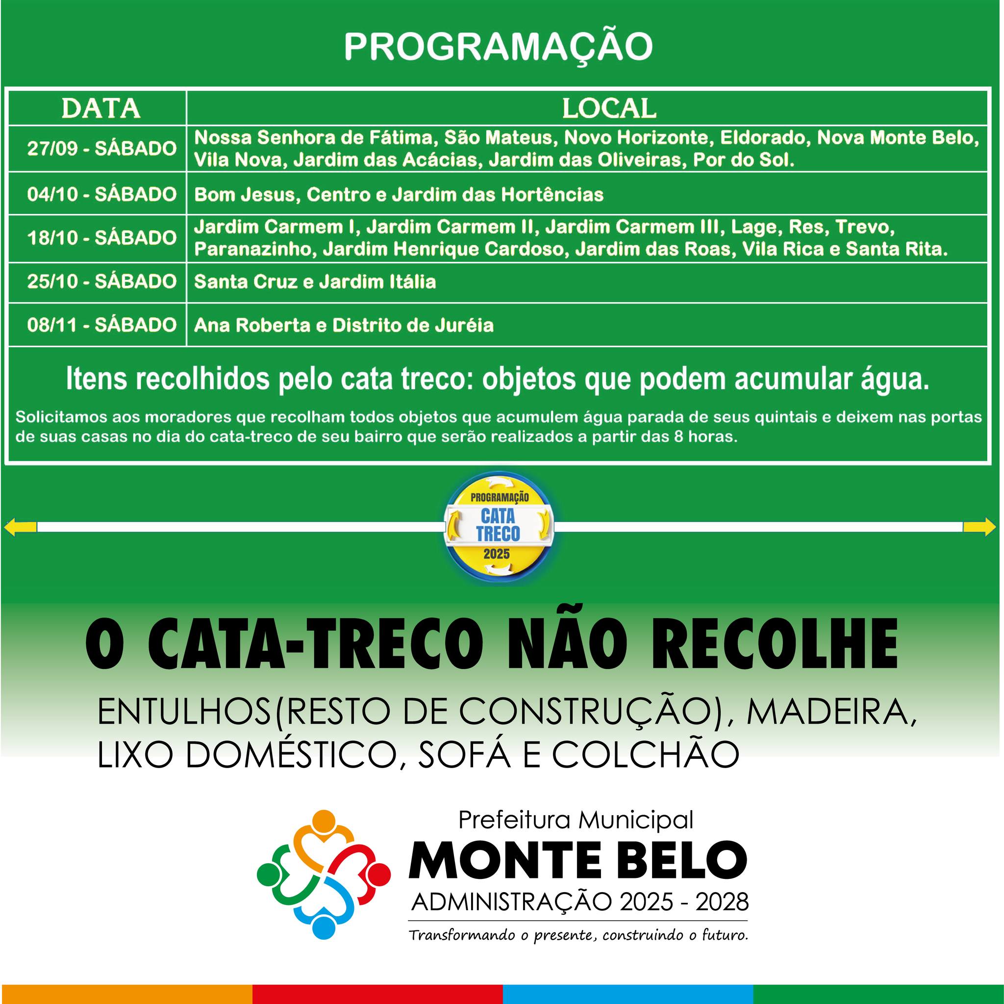 ATENÇÃO, MONTEBELENSES: CRONOGRAMA DA COLETA DE LIXO