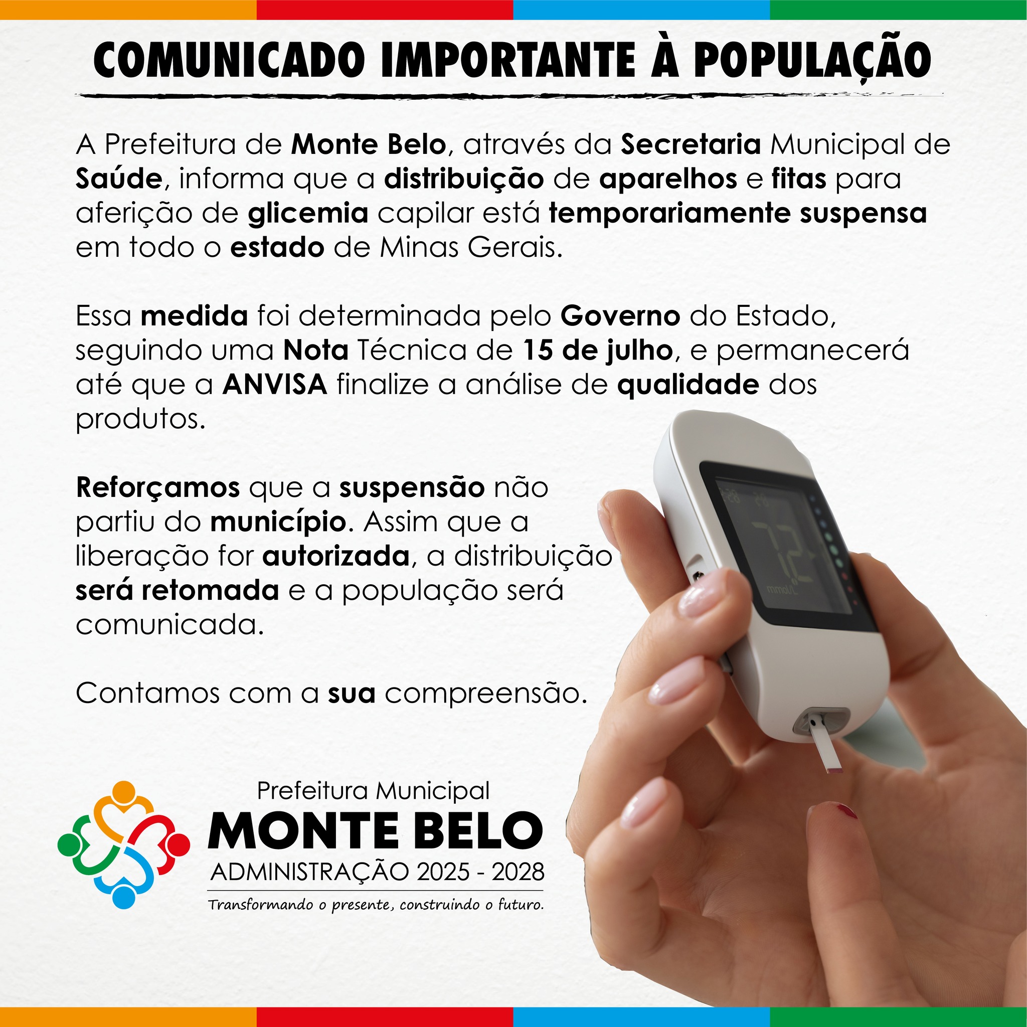 A Prefeitura de Monte Belo, através da Secretaria Municipal de Saúde, informa que a distribuição de aparelhos e fitas para aferição de glicemia capilar está temporariamente suspensa em todo o estado de Minas Gerais.